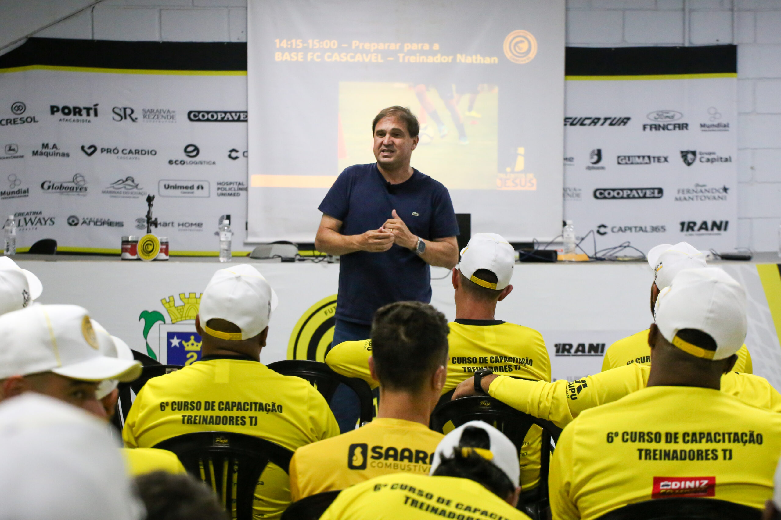 Neste sábado (07), o Projeto Talentos de Jesus promoveu a Capacitação dos Treinadores, reunindo 60 professores, auxiliares e secretários dos 27 núcleos da iniciativa em um momento fundamental de alinhamento, troca de experiências e fortalecimento da formação profissional. O encontro teve como principal objetivo preparar os educadores para os desafios de 2026, apresentando avanços dentro e fora de campo e qualificando ainda mais o trabalho desenvolvido junto aos alunos.